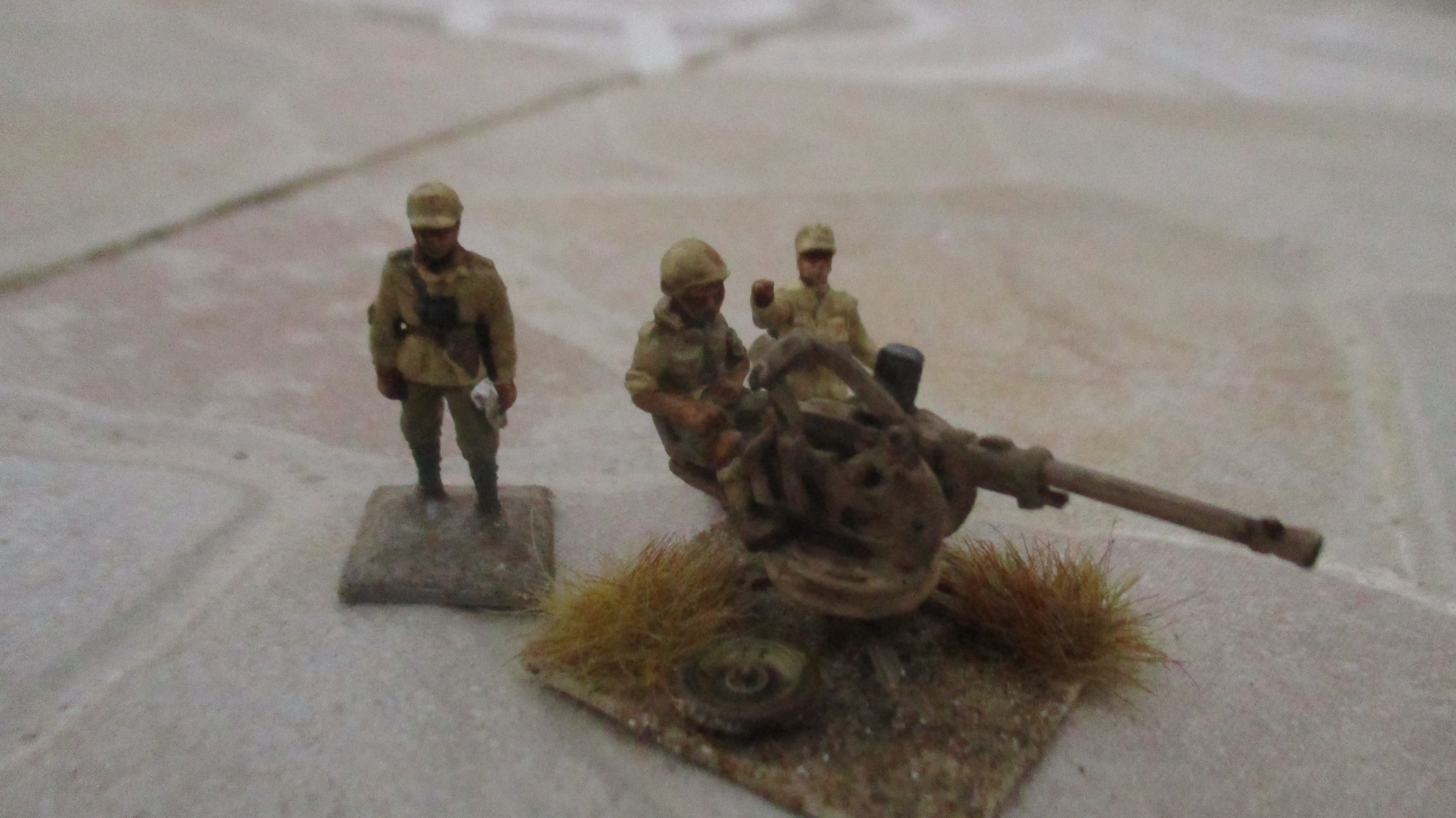Now waste not, want not, I scratched together a tripod mount, used the wheels I removed from the towed gun, head-swapped the original Raventhorpe gunner and painted up a couple of plastic Italeri Italians to create a ground deployed Breda and crew for my Italians too :)