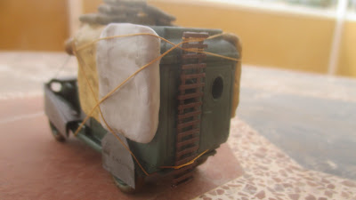 Second one off the production line, again the idea is to represent a vehicle scratch built and adapted in a local workshop, not constructed to a standard plan. You will note the frontal armour on this one is a more complicated design.To help support the heavy frontal armour they have run two steel cables secured to the cab. I decided the flat open top would make a good fighting compartment, so added the sandbags & access ladder